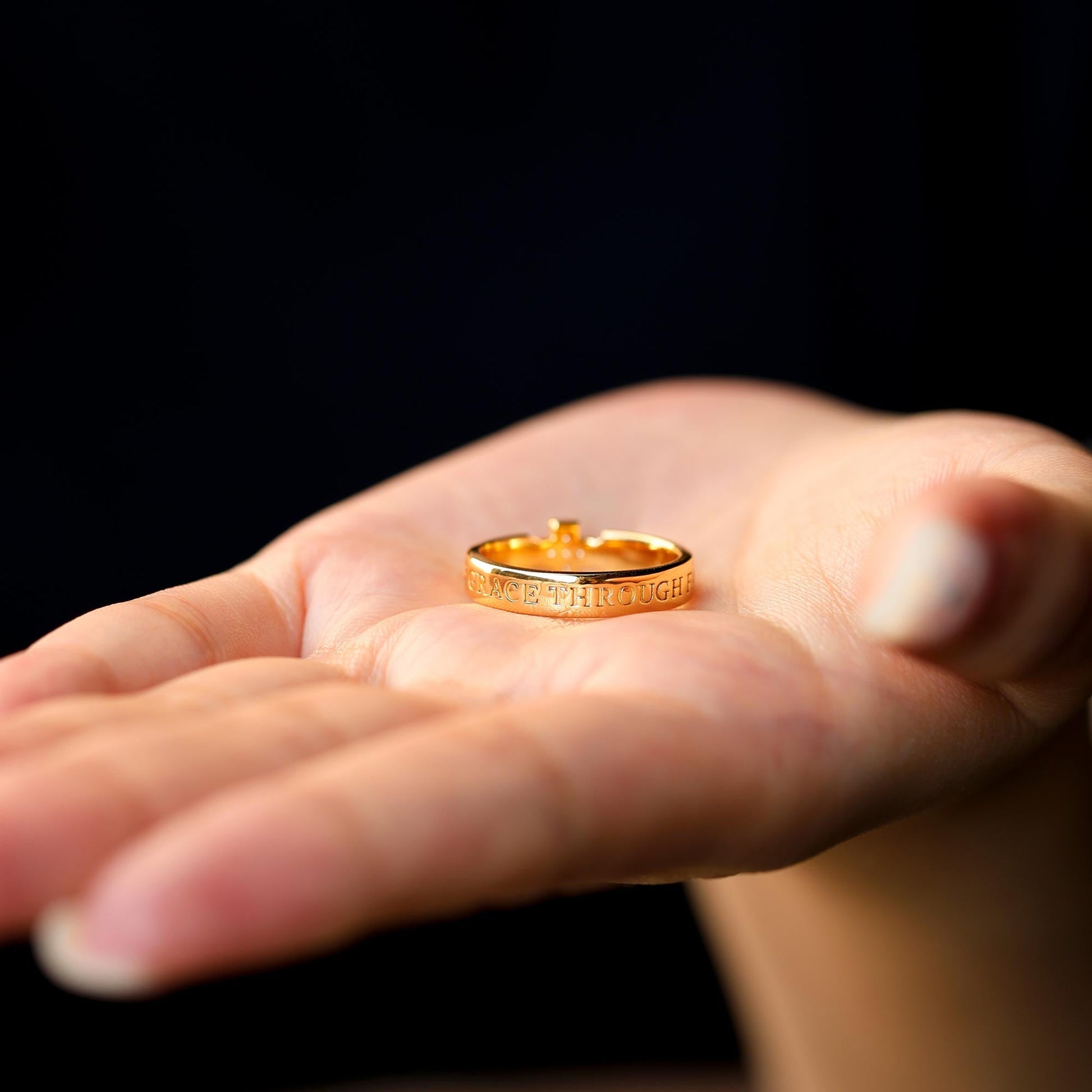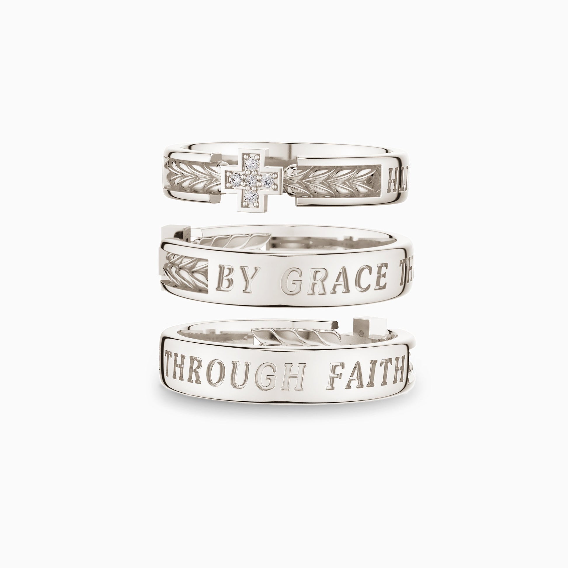On the reverse side, the band is engraved with the inspiring words "By Grace Through Faith," a reminder of the power of belief and grace in everyday life. This thoughtful engraving and natural design make this ring a meaningful accessory, perfect for those who appreciate the symbolism of growth, faith, and divine grace.