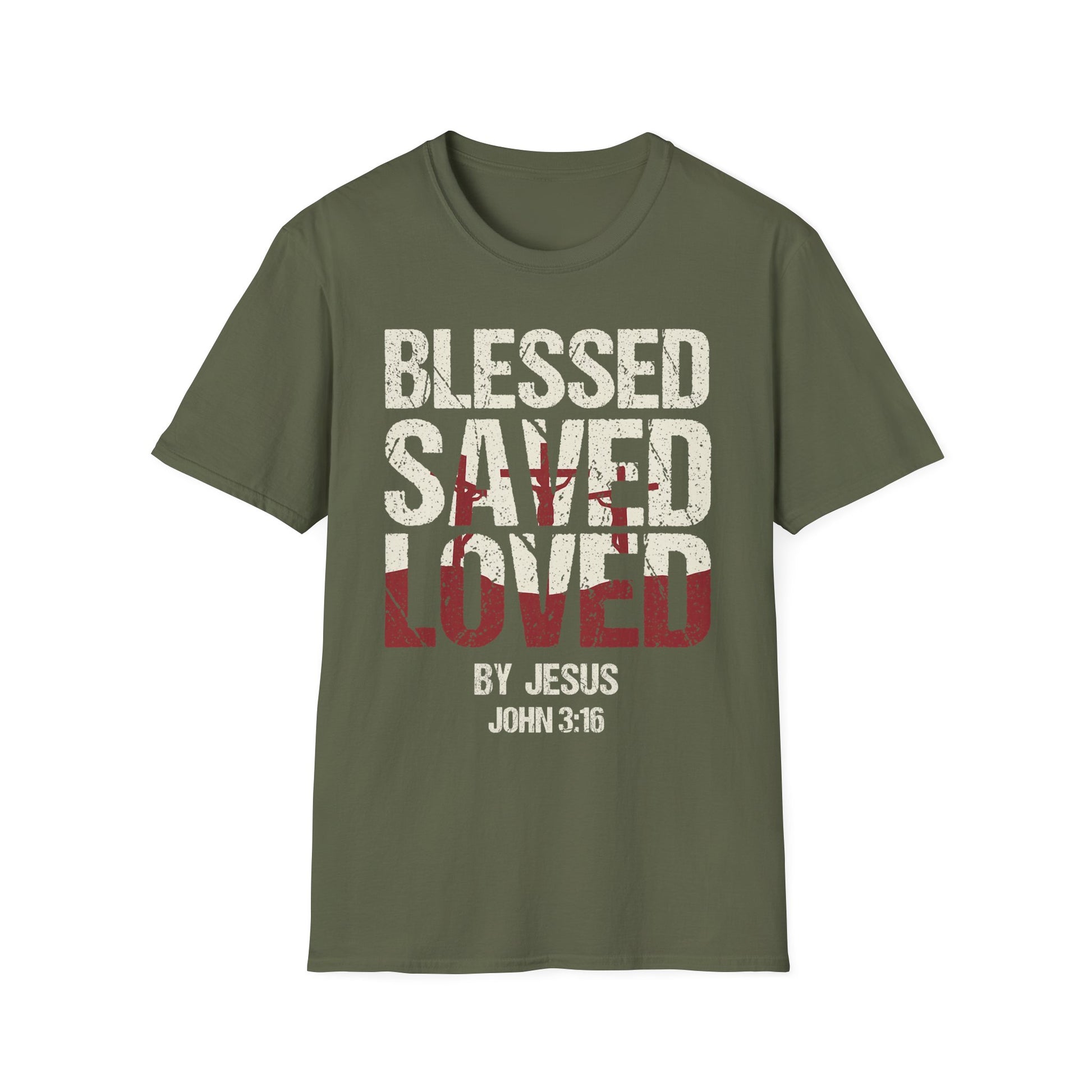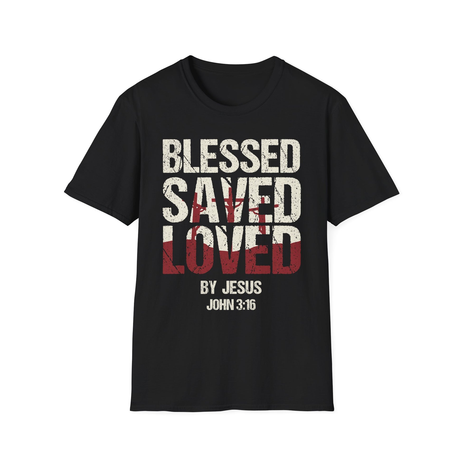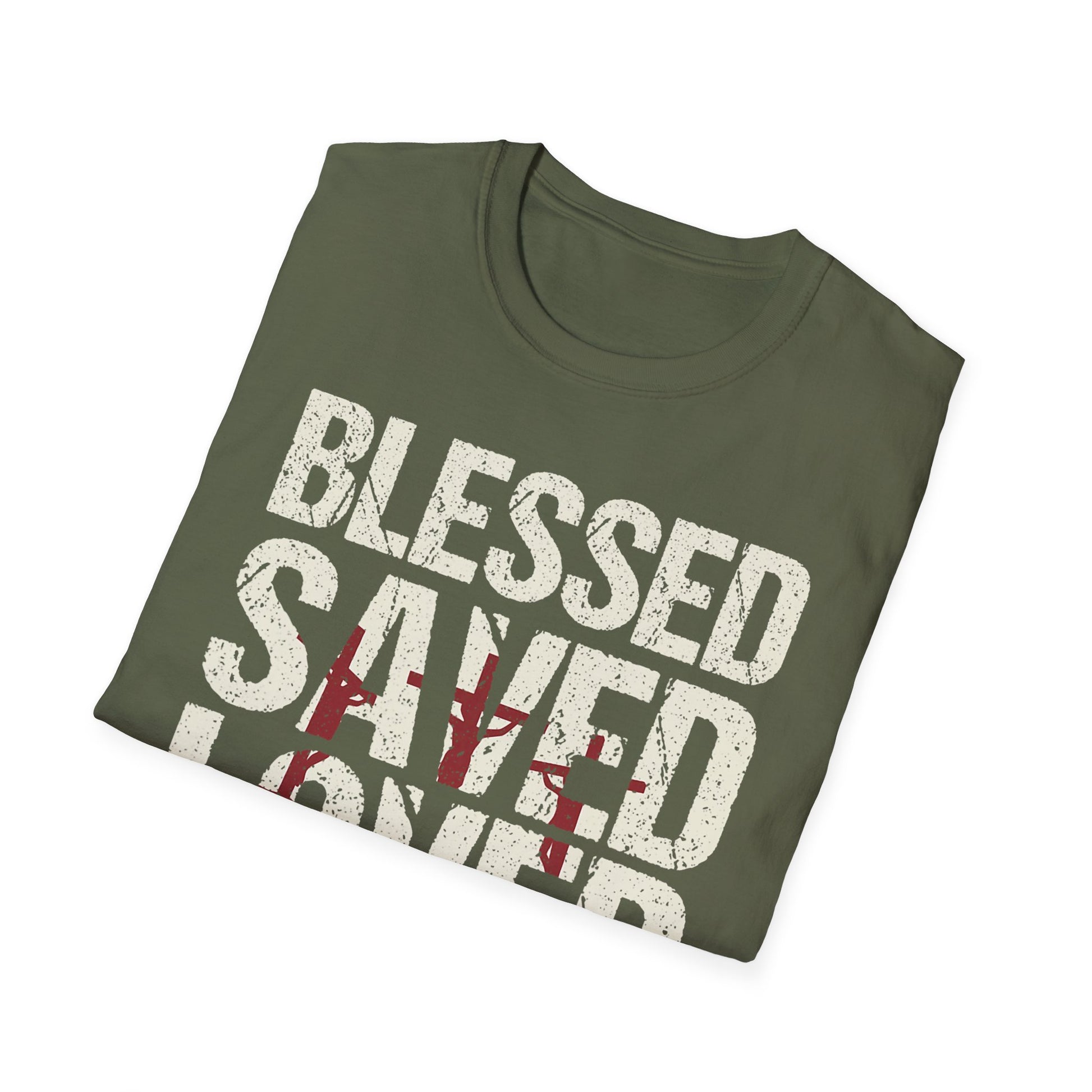 Faith-Inspired Graphic T-Shirt - Blessed, Saved, Loved - Perfect for Church, Gifts, or Everyday Wear