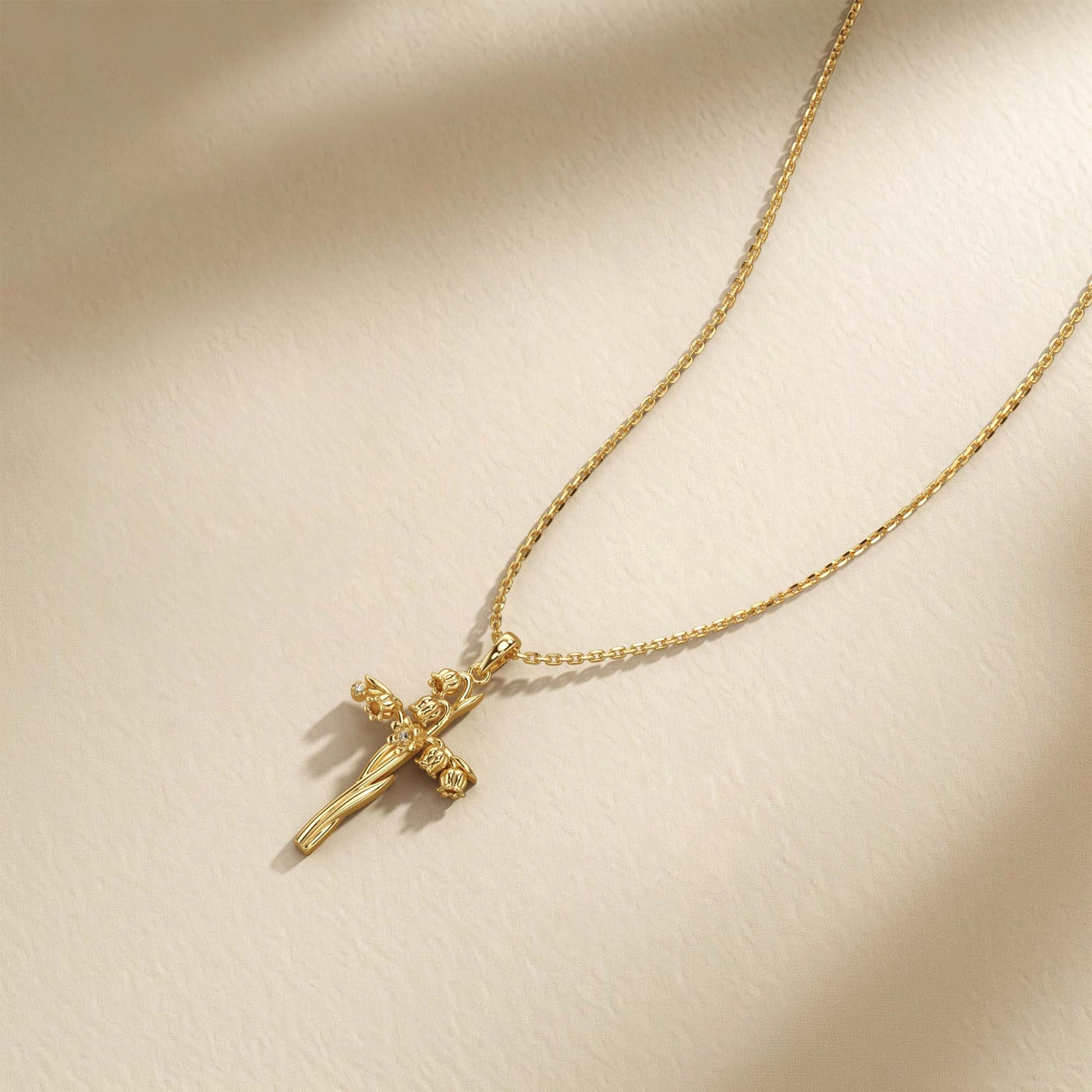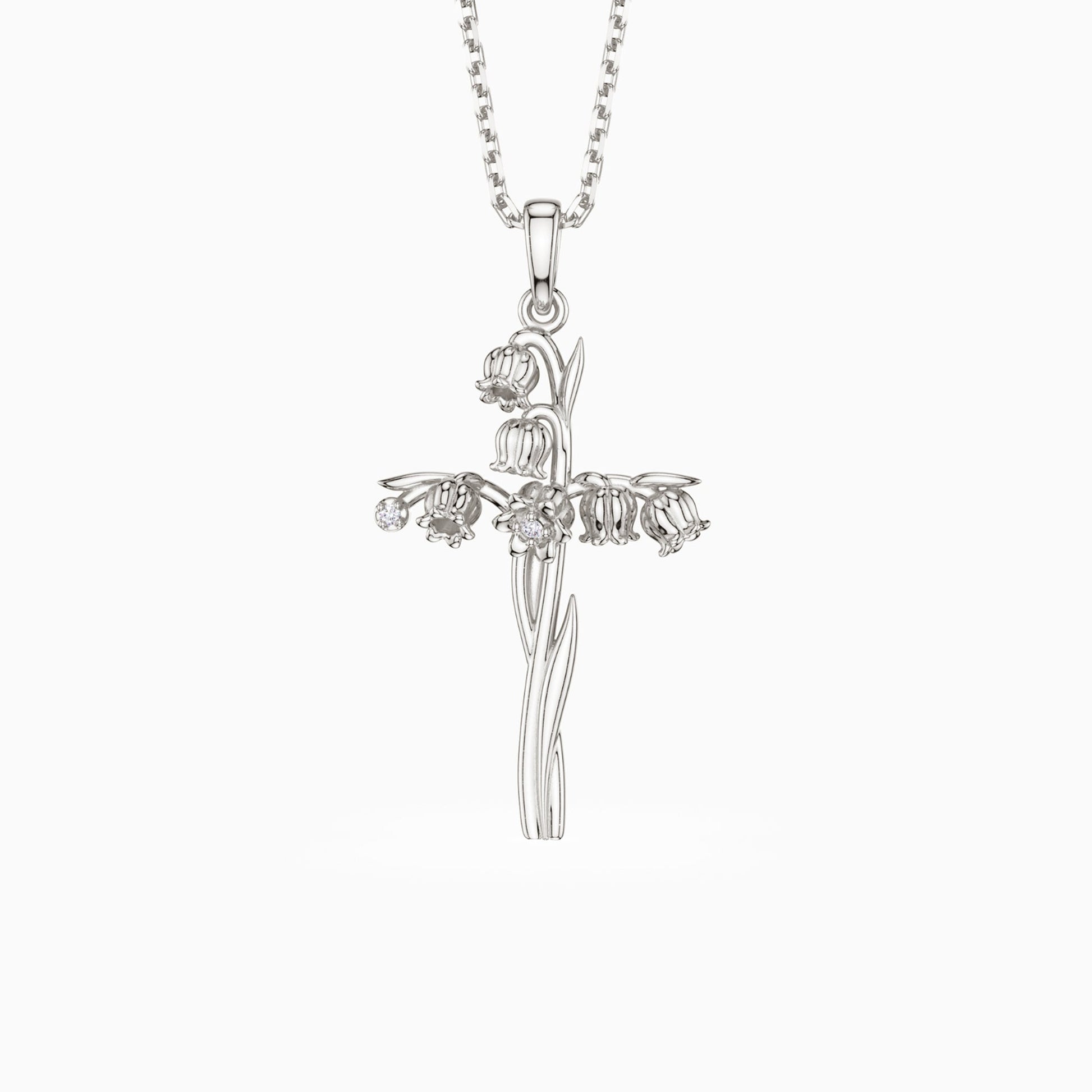 The "Floral Cross Collection" in May heralds the charm of the Lily of the Valley, a flower celebrated for its profound symbolism of happiness, sweetness, and humility. Intricately designed, this pendant intricately intertwines the delicate blossoms of the Lily of the Valley around a sleek cross, embodying the Christian virtues of the Virgin Mary’s humility and gentleness. The fine details in the pendant not only showcase the beauty and intricate architecture of the flower but also mirror the essence of Mary's character, making this piece a profound emblem of purity and devoted love. Perfect for those who cherish deep-rooted values and seek to carry a symbol of serene grace and divine tenderness.
