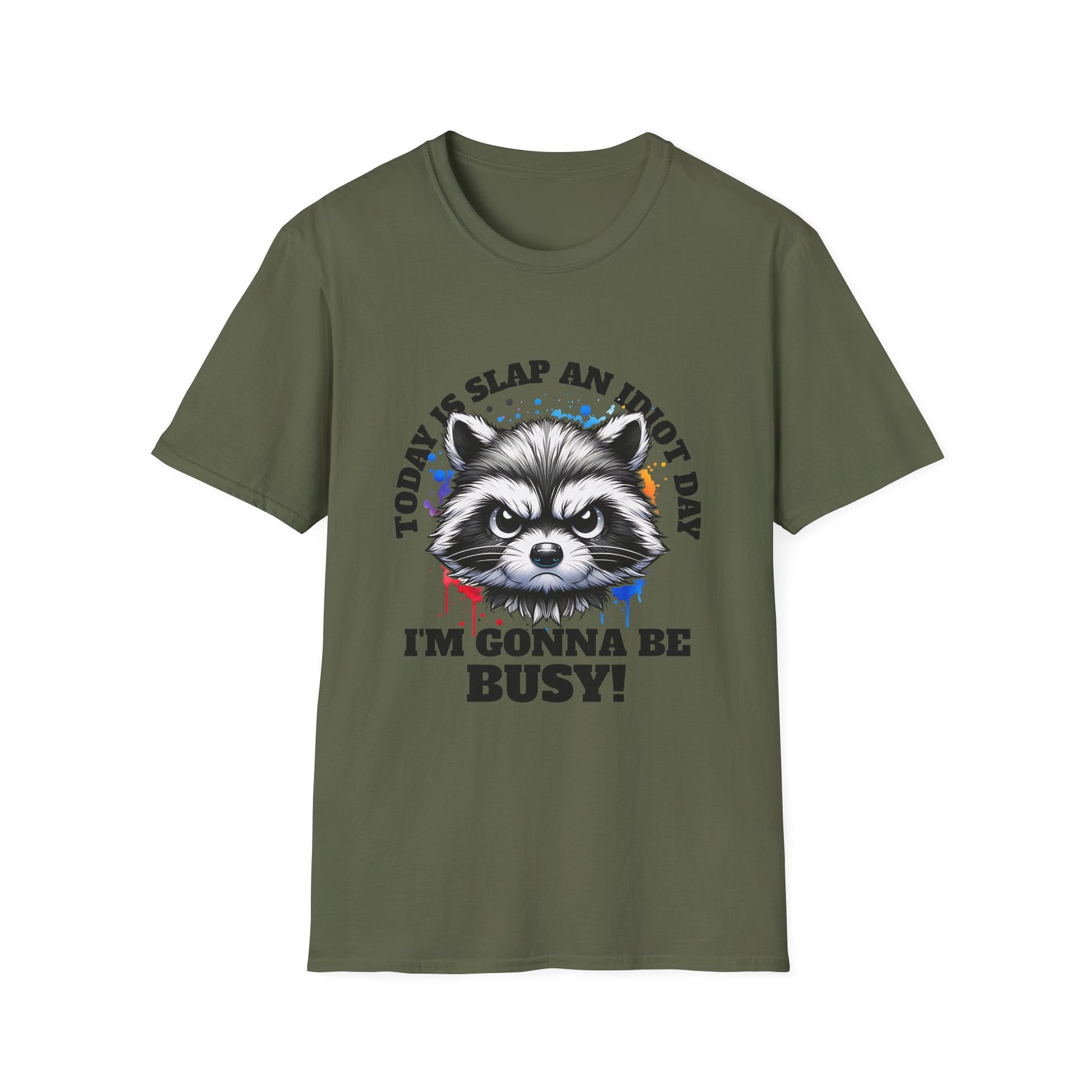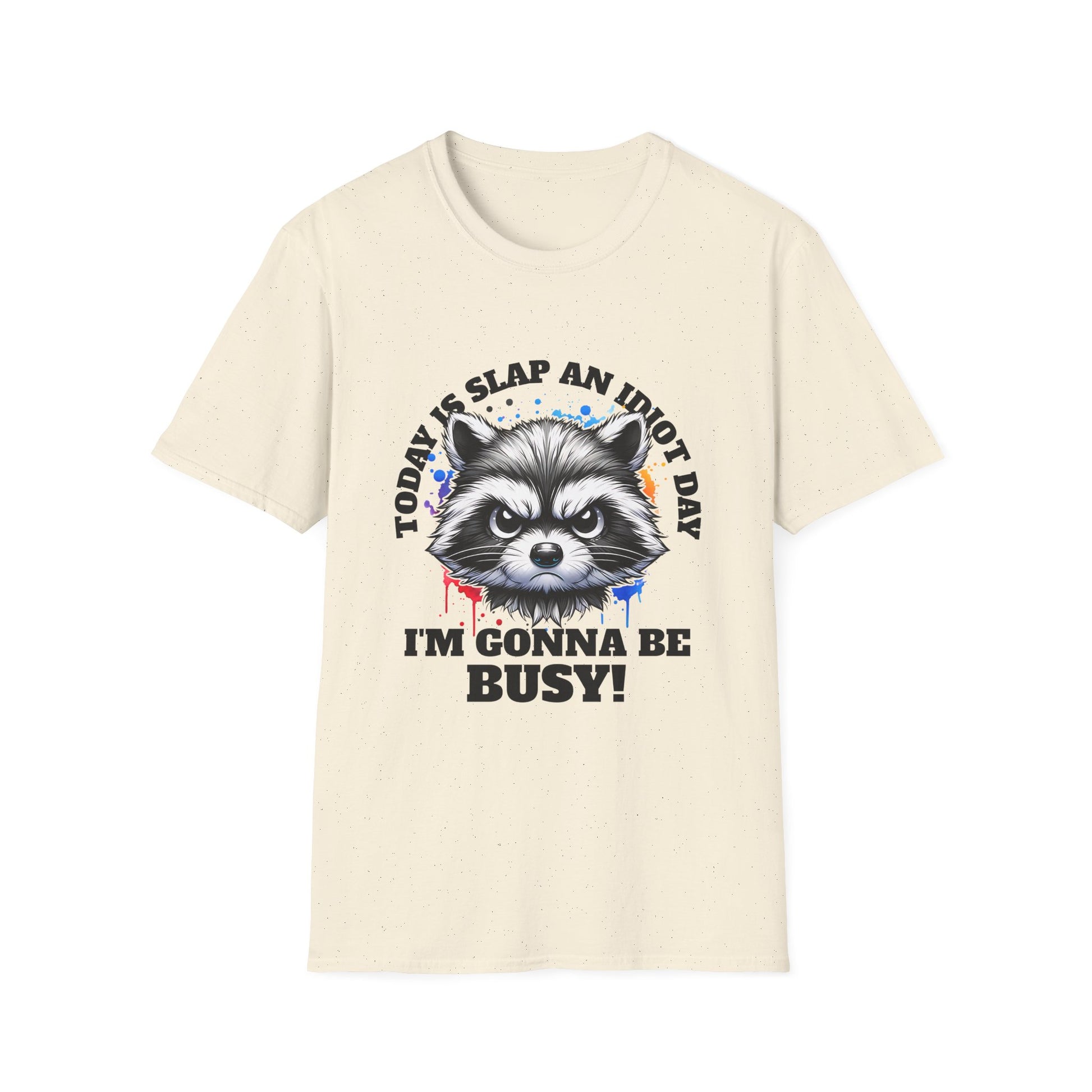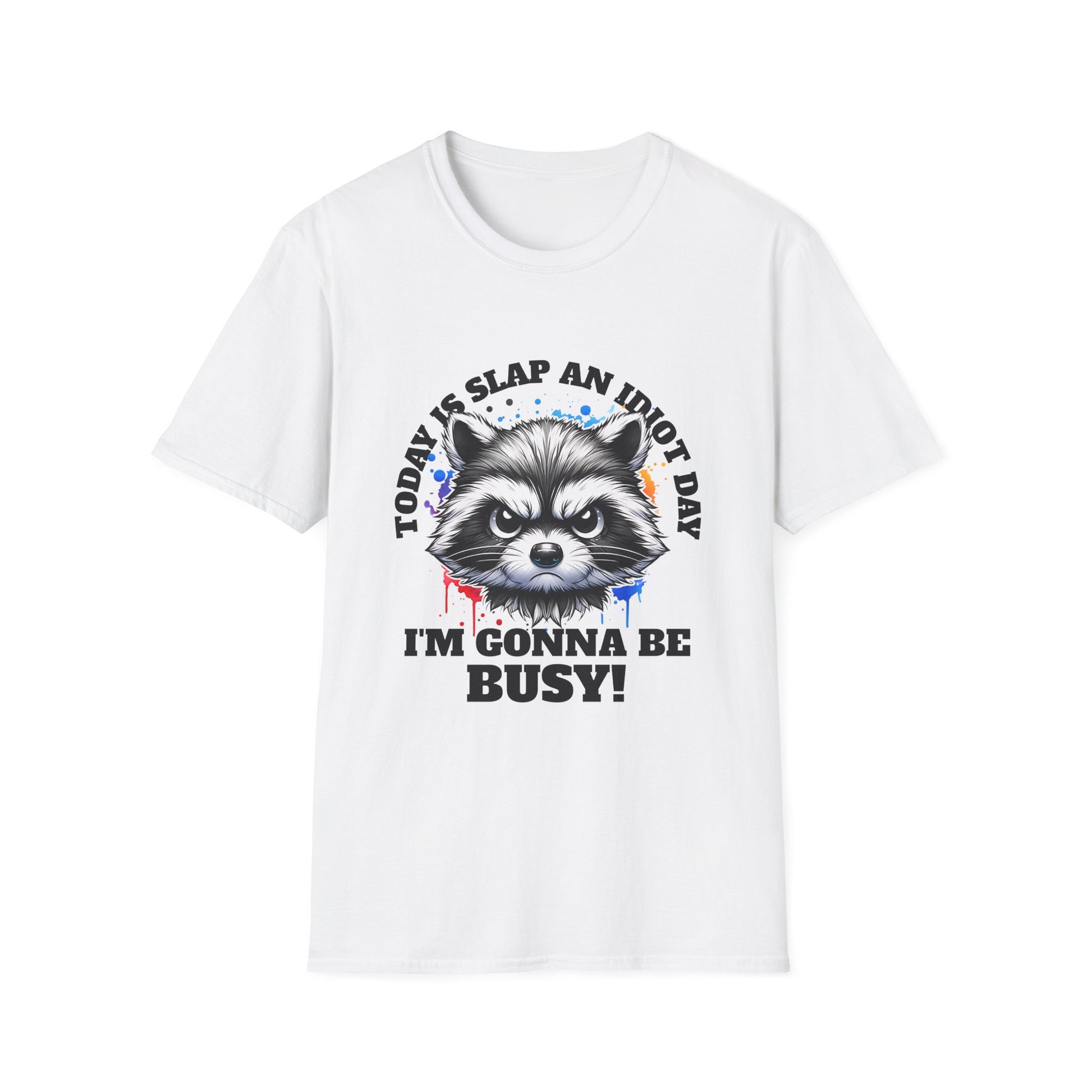 This Unisex Softstyle T-Shirt combines comfort and humor in one stylish package. Featuring a playful raccoon design and the phrase 'Today is Slap an Idiot Day, I’m Gonna Be Busy!', this shirt brings a light-hearted vibe to any casual occasion. Crafted from soft and durable cotton, it feels great against the skin, making it perfect for daily wear, parties, or casual outings with friends. It's a must-have for those who enjoy a good laugh and appreciate quirky fashion. This tee is a fun gift idea for celebrations, including birthdays, anniversaries, or just to brighten someone’s day. Ideal for individuals with a sense of humor, this shirt can be enjoyed by friends, family members, or anyone who loves to express their personality through their attire.