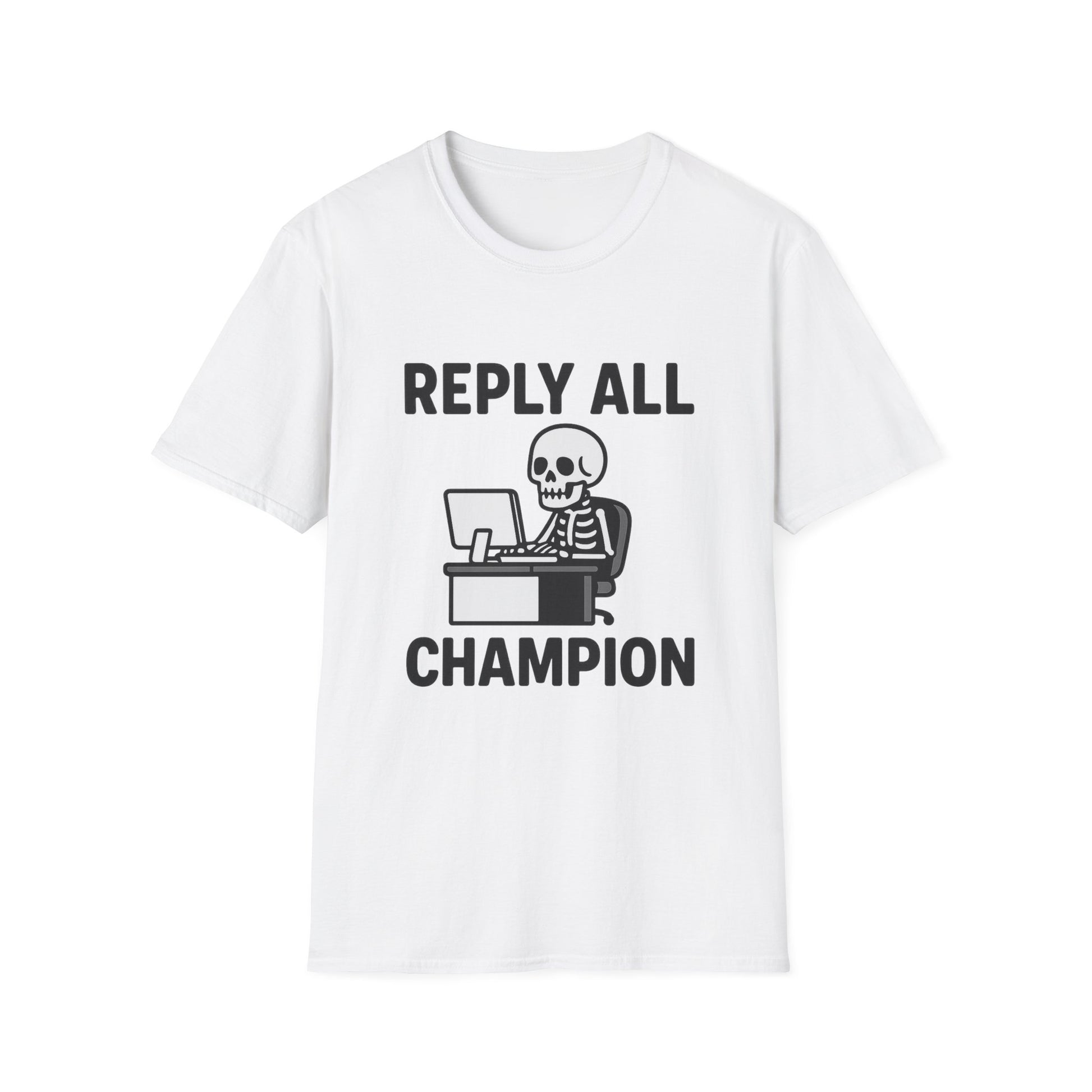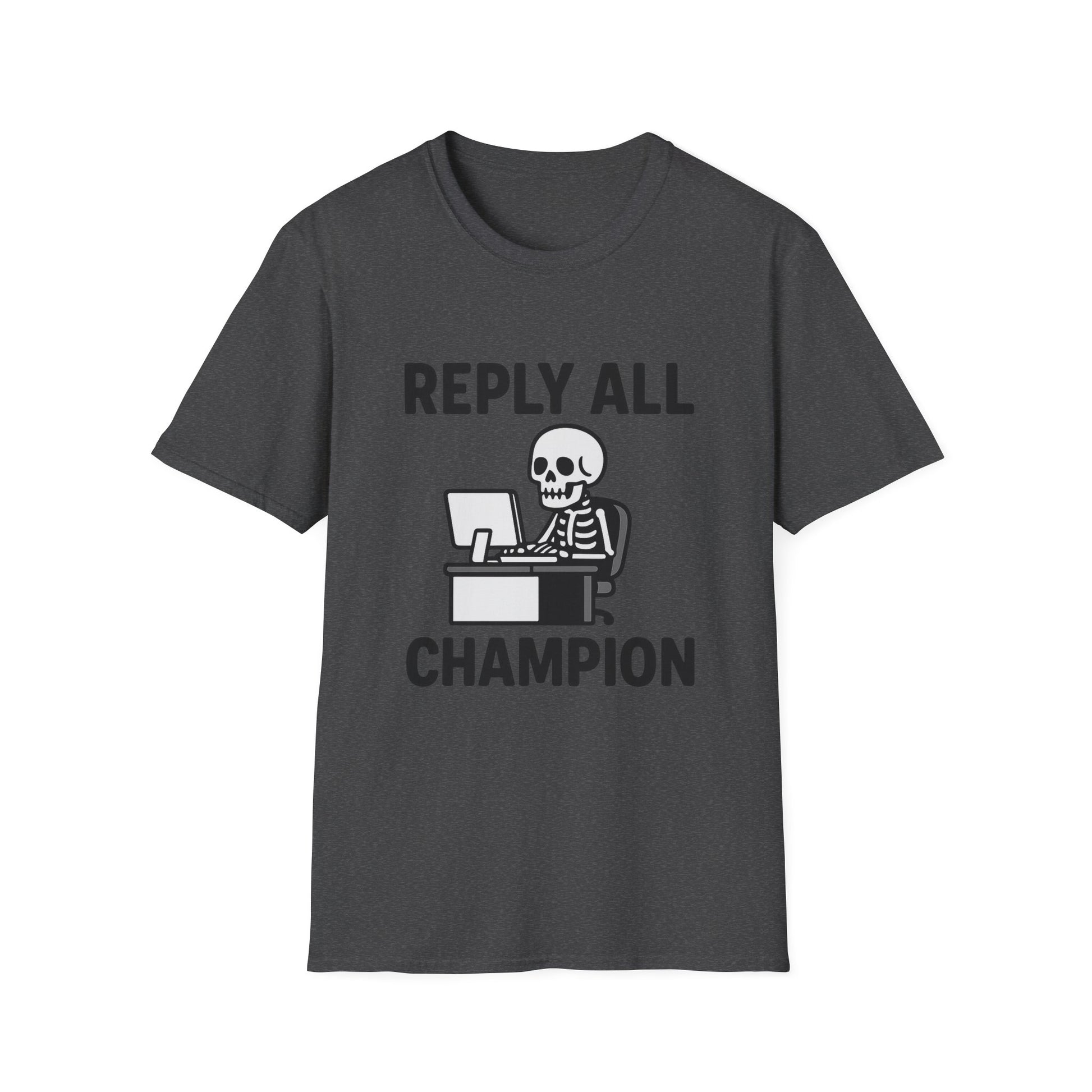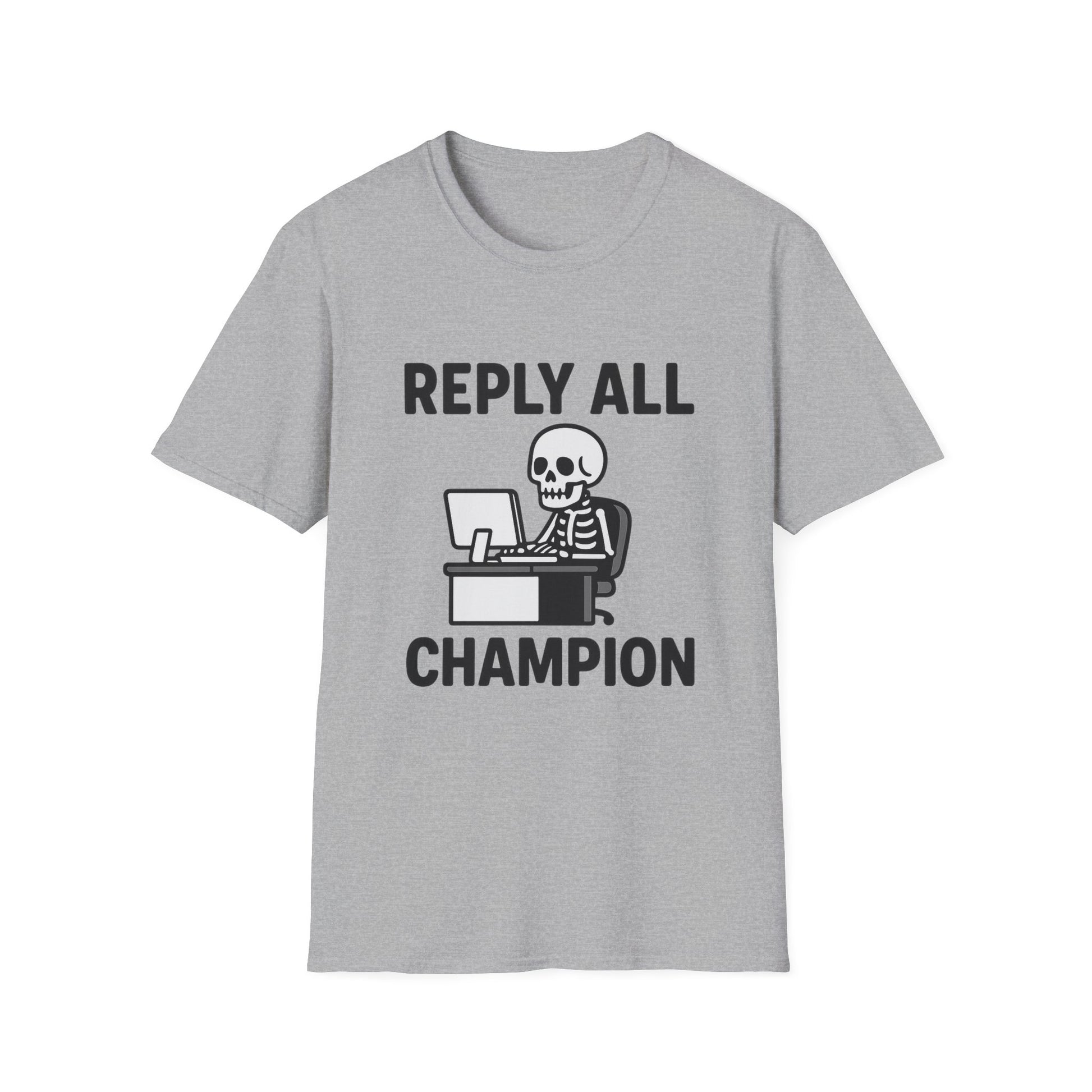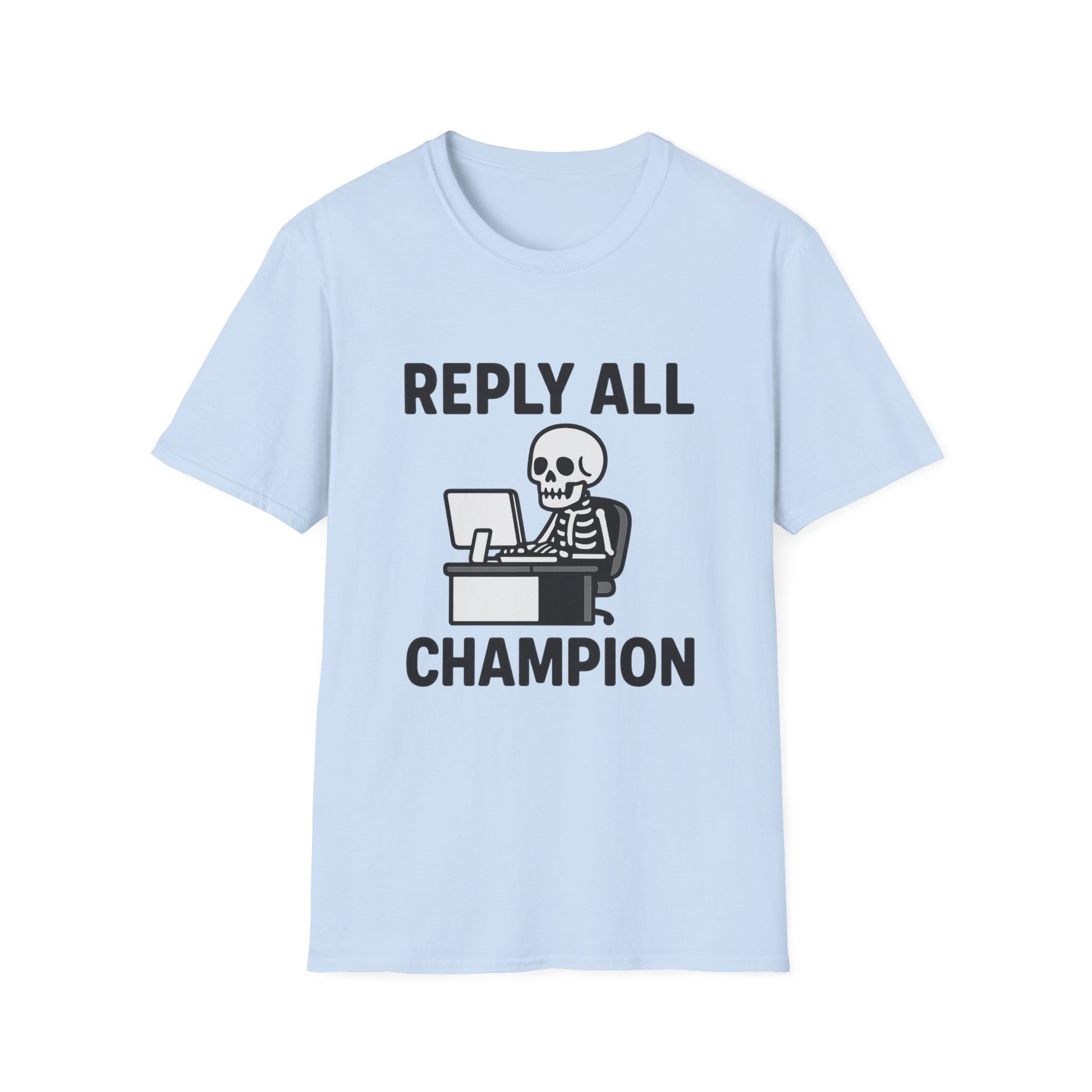 Reply All Champion Skeleton T-Shirt, Funny Office Humor Tee, Unisex Casual Wear, Halloween Gift, Great for Coworkers, Meme Lovers