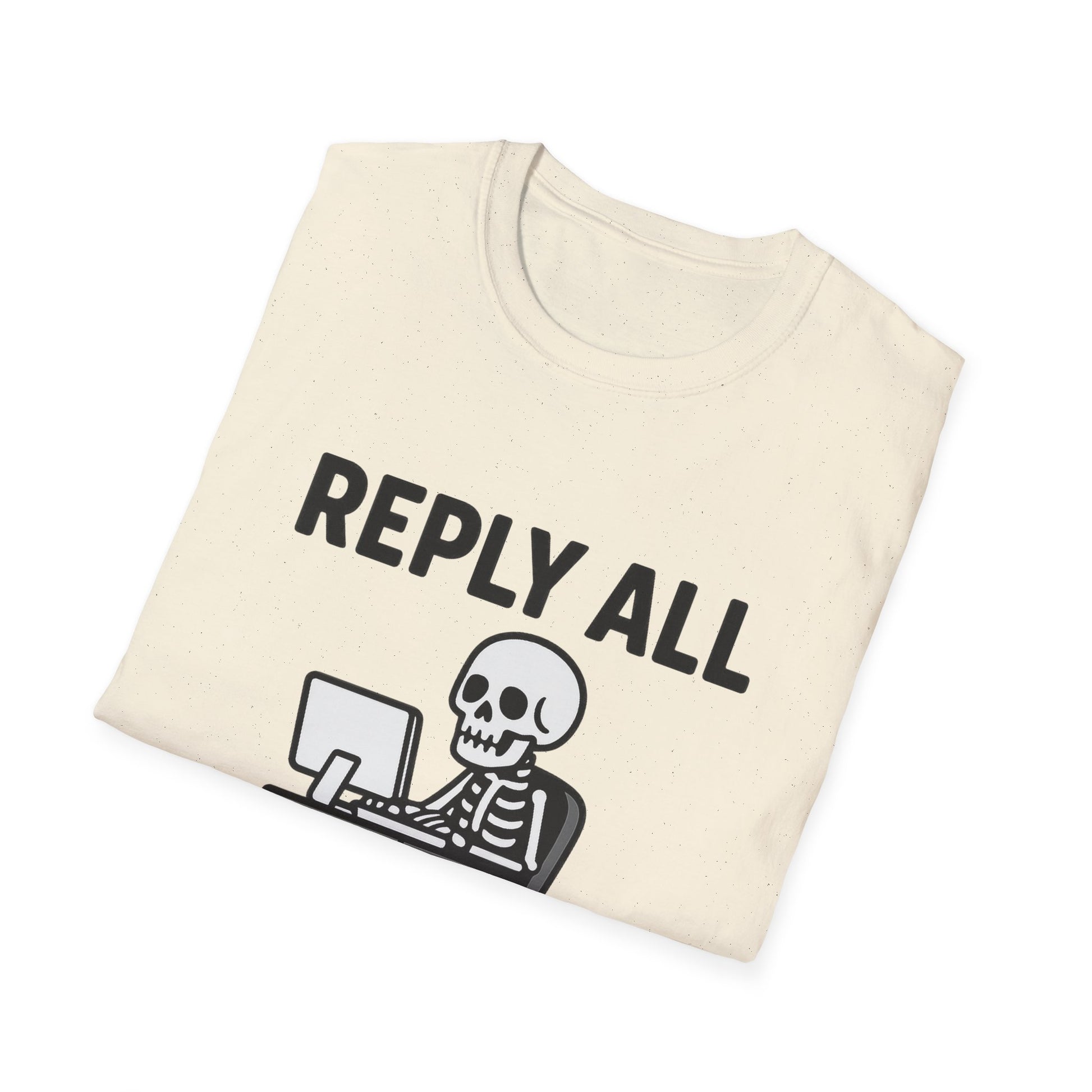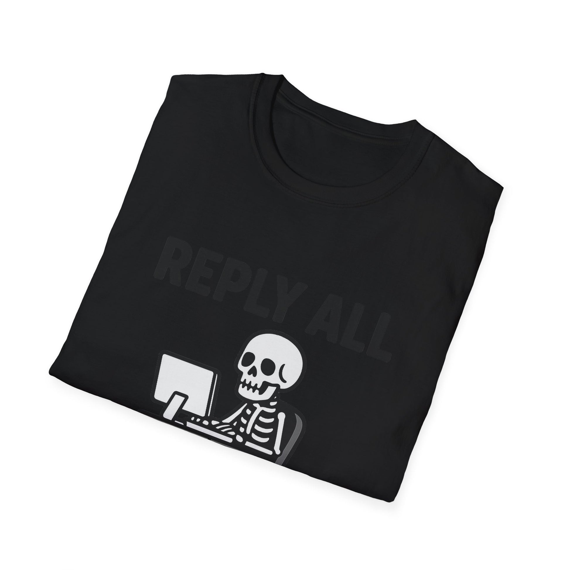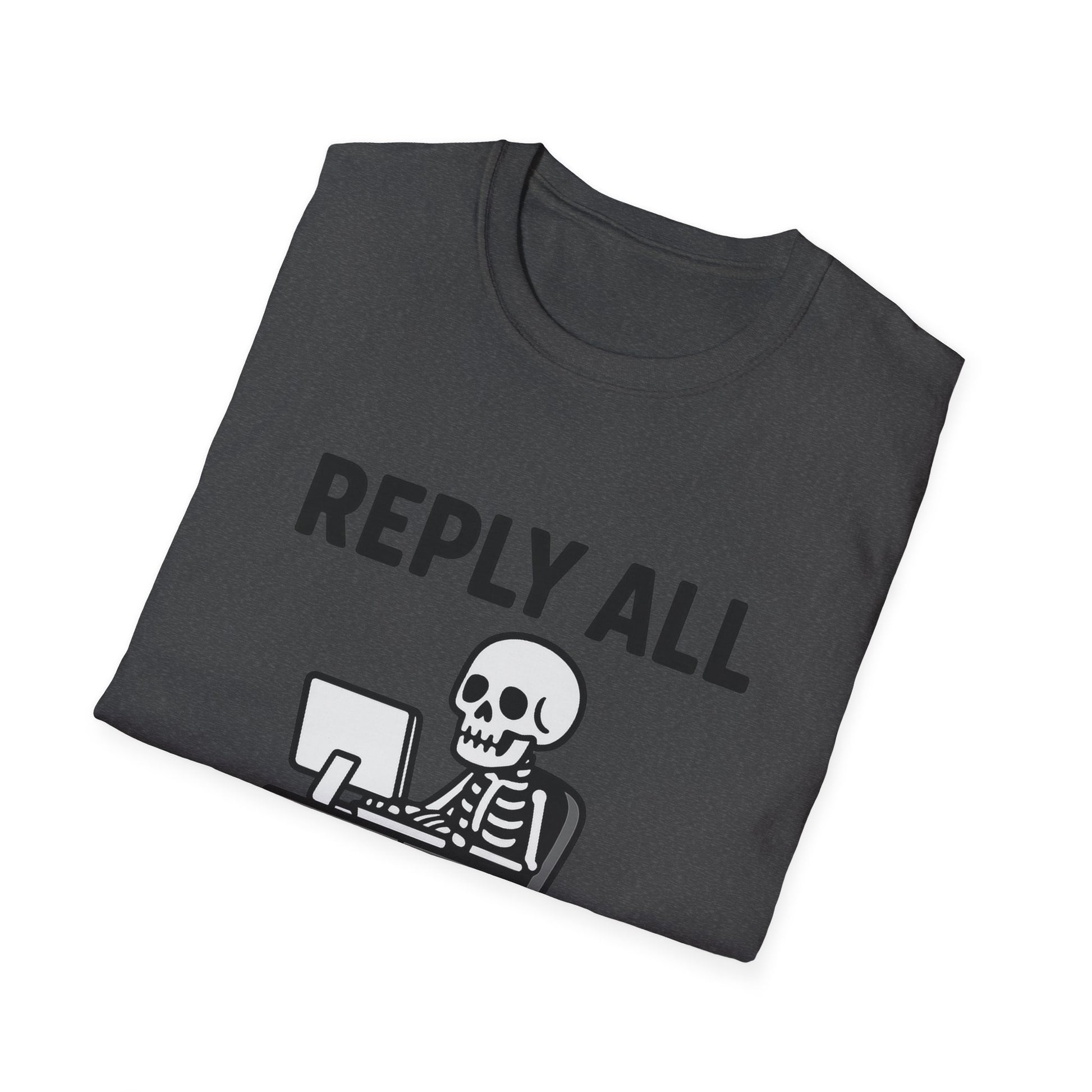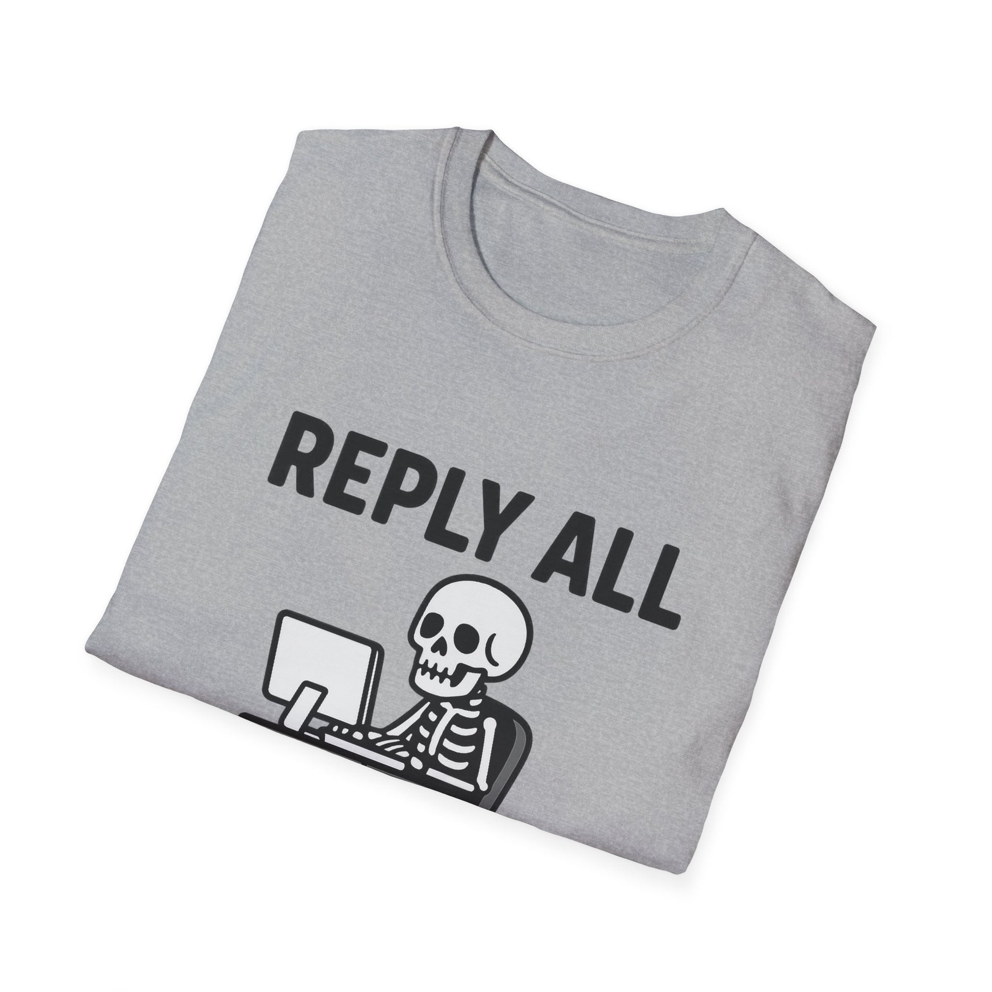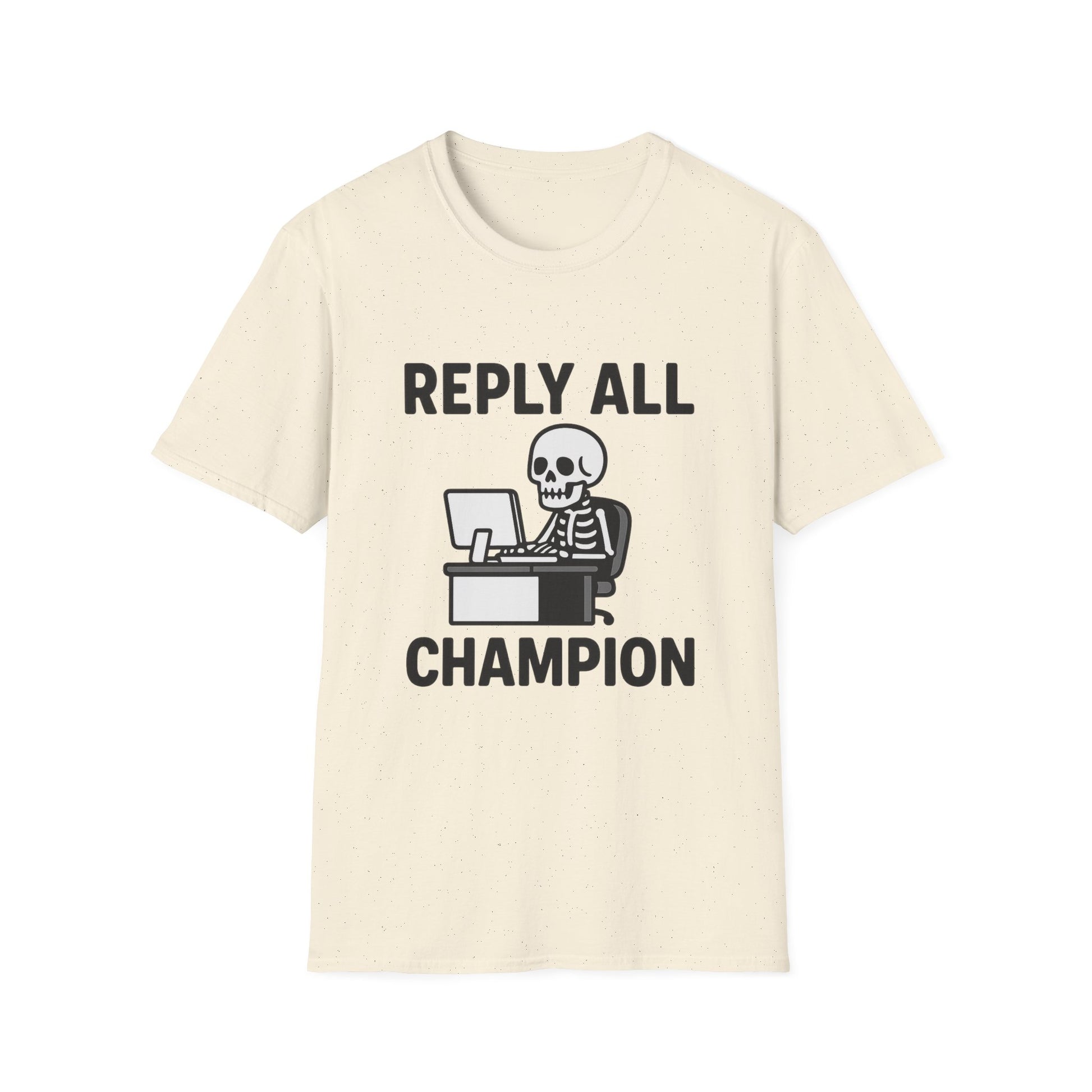 Reply All Champion Skeleton T-Shirt, Funny Office Humor Tee, Unisex Casual Wear, Halloween Gift, Great for Coworkers, Meme Lovers